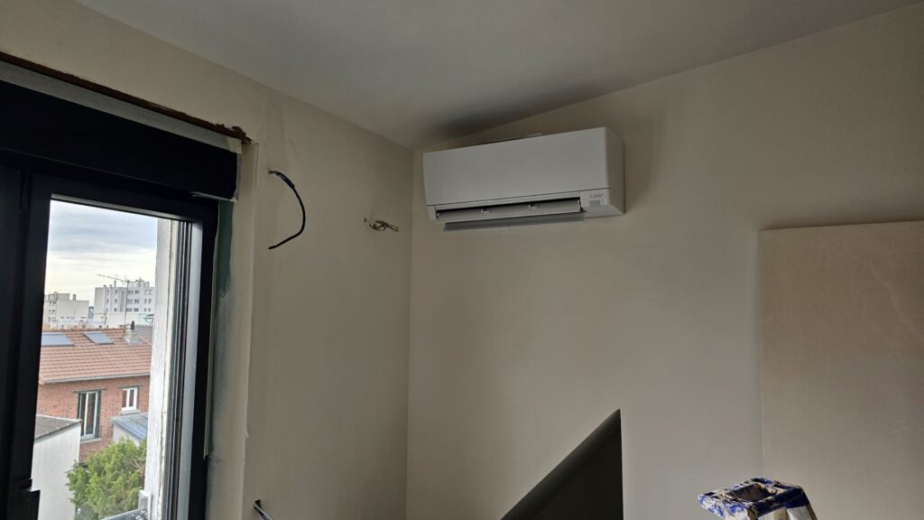 Pour ce projet, Climax77 a sélectionné un split mural Mitsubishi Electric, une référence en matière de confort et de fiabilité. Les unités intérieures de la marque sont connues pour leur design sobre, leur performance énergétique (classe A++ ou A+++), et leur fonctionnement ultra silencieux, souvent inférieur à 20 dB en mode nuit.